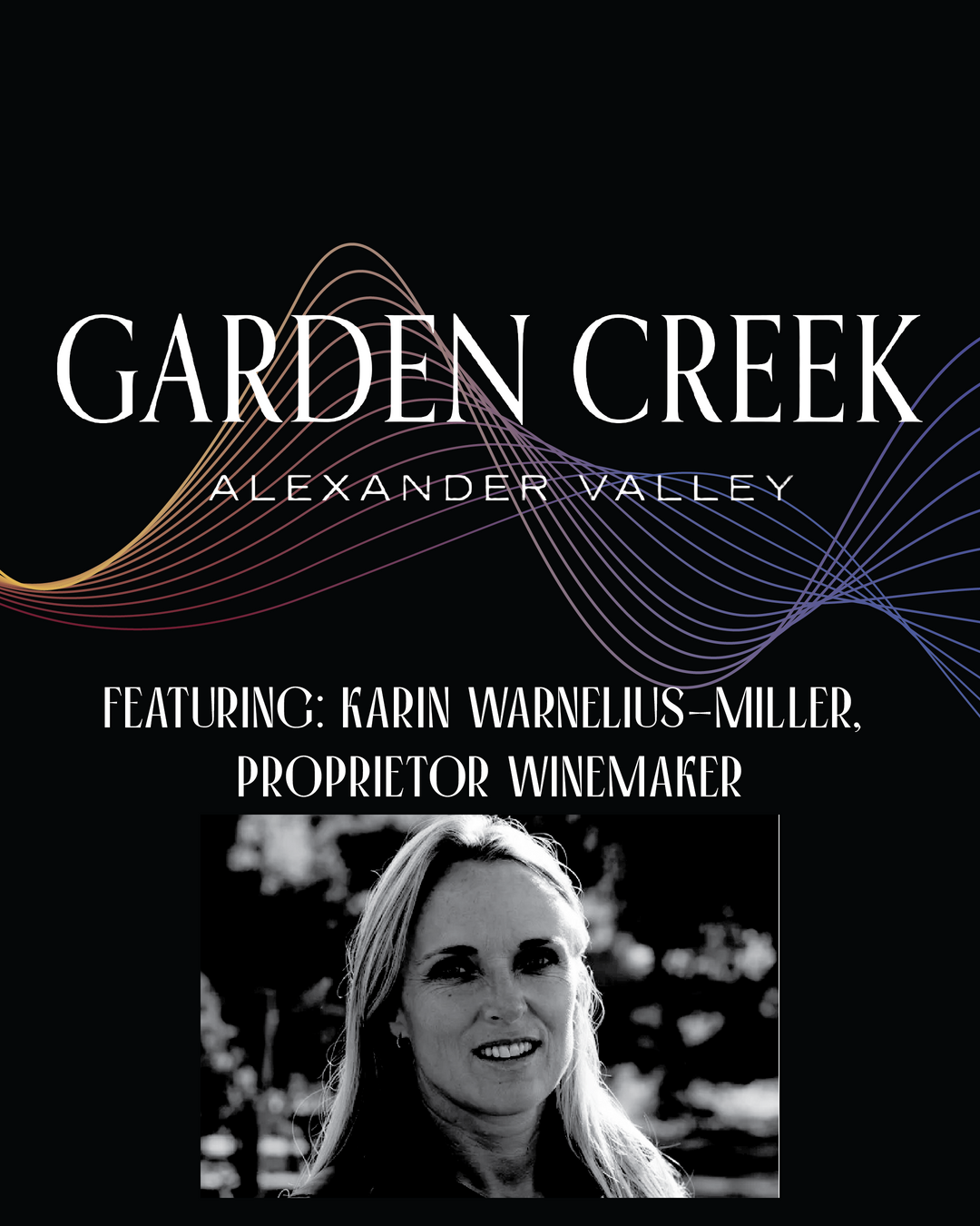 Garden Creek Ranch Vineyards & Winery located in the Alexander Valley of Northern Sonoma Wine Country - family farming roots dating back to the 60’s. With 56 years of grape growing and 25 years of winemaking - this exquisite, allocation-only brand is a dedicated partnership by husband and wife, Justin Miller & Karin Warnelius-Miller – the winegrowers and winemakers of their handcrafted wines. Wine growing 75-acres of vineyards since 1969 and producing wines since 2001, their commitment lies in their land. With a focus on their intriguing soils, the marine climate, variations in the clonal variations and patience to craft small production Cabernet Sauvignon and Chardonnay, their wines are grown, produced and bottled on their property in Alexander Valley.